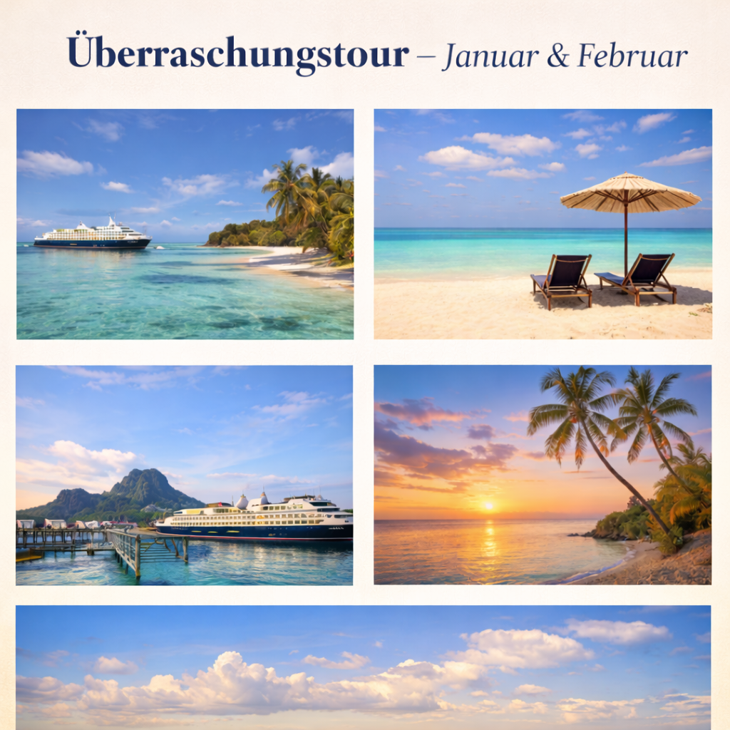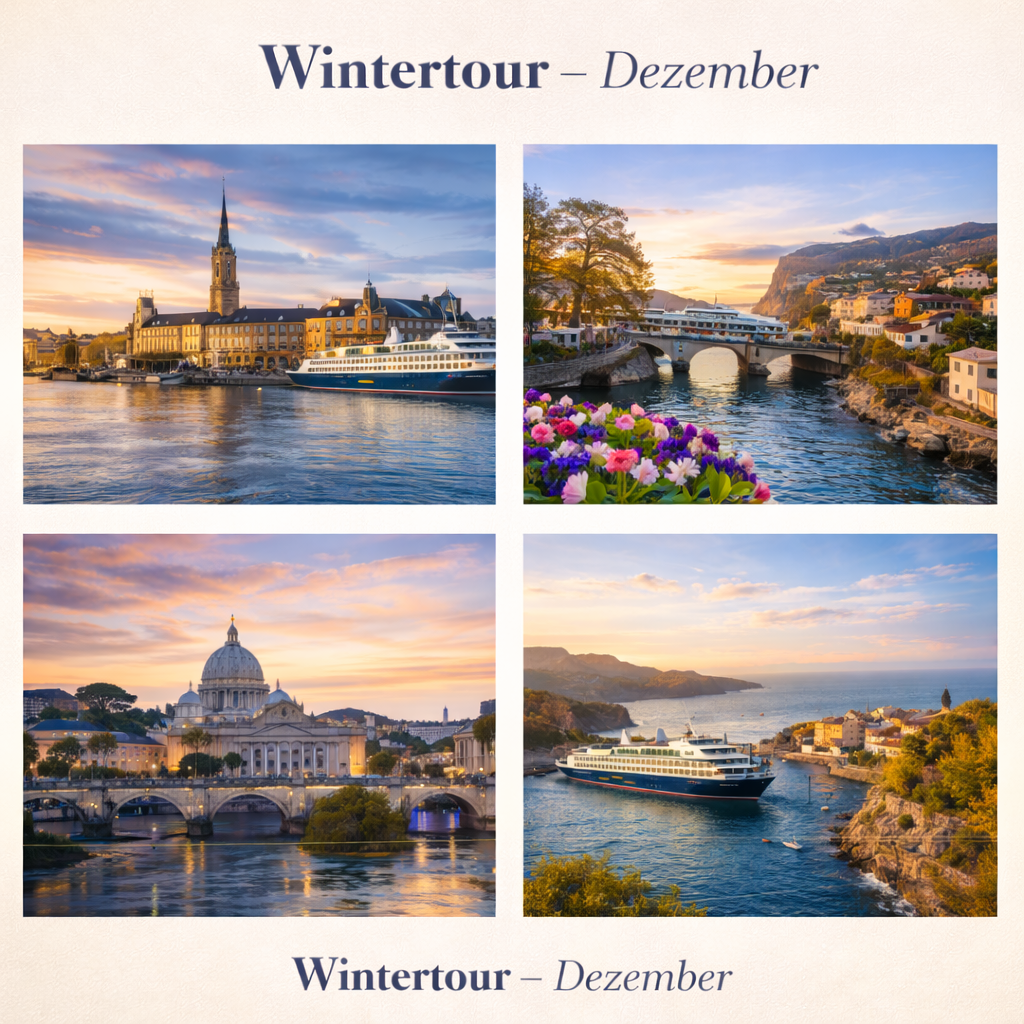 Wenn die Welt stiller wird, beginnt auf der MS Abendstern eine ganz besondere Reise. Die Überraschungstour führt unsere Gäste zu ausgewählten, sonnigen und ruhigen Orten, die erst kurz vor der Abfahrt bekanntgegeben werden. So bleibt jede Route ein kleines Geheimnis – voller Entspannung, milder Winterluft und dem Gefühl, dem Alltag noch einmal ganz neu zu entkommen.