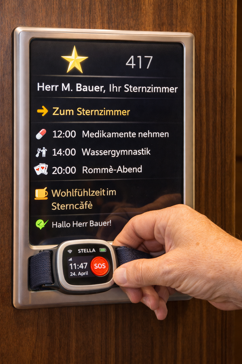 An jeder Tür befindet sich ein eigener Stella-Monitor, und sobald jemand sein Sternenband daran hält, erkennt Stella sofort, wer dort steht. Auf dem Bildschirm erscheint dann automatisch ein individueller Wegweiser zum eigenen Sternzimmer, Sternraum oder zur Sternkammer, ergänzt um alle relevanten Informationen für diesen Menschen: Wann ist die nächste Medikamenteneinnahme fällig, welche Termine stehen heute an, wo beginnt gleich die Wassergymnastik oder der Kartenabend, und welche Angebote könnten gerade gut tun.
